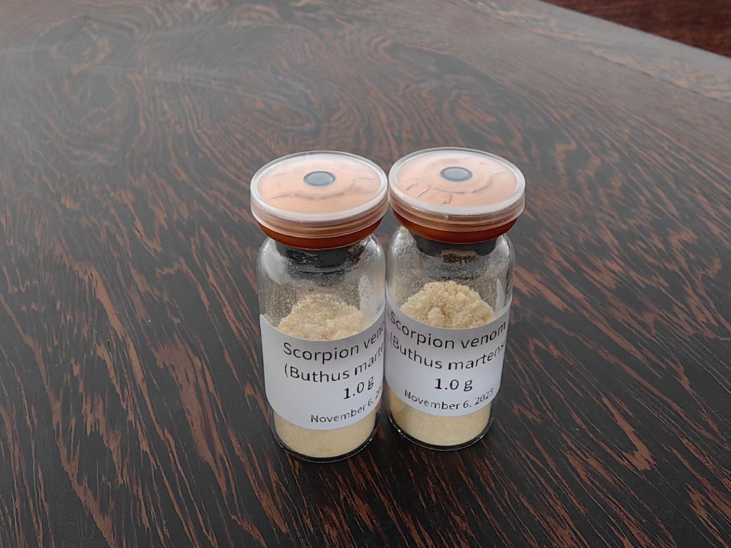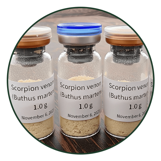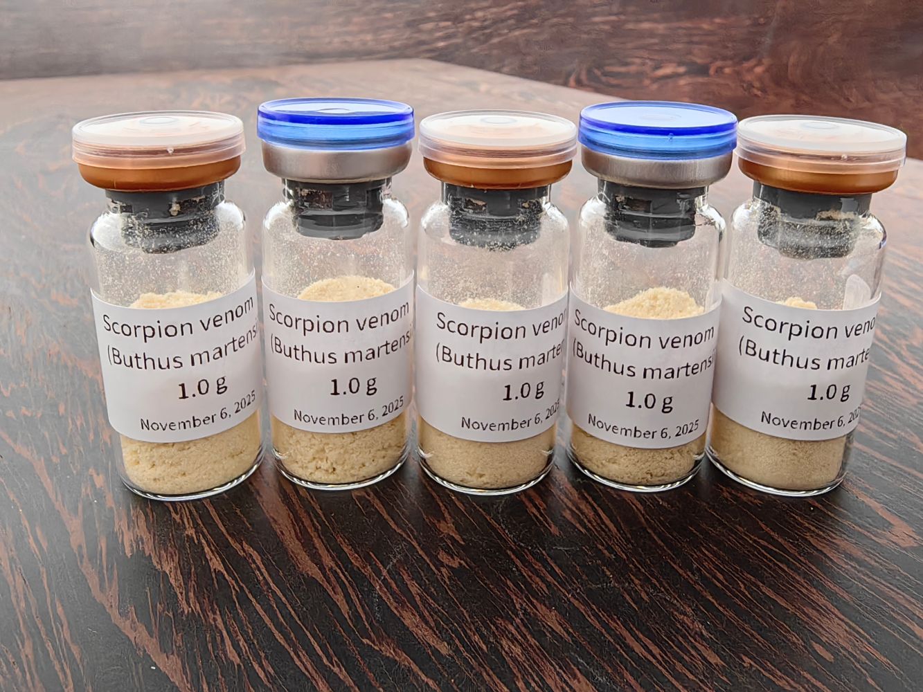 The venom of Buthus martensii (the Chinese scorpion) is a biotoxin characterized by complex components and diverse properties, with detailed elaborations as follows: 1.Source and Collection Derived from Buthus martensii, a scorpion species under the family Buthidae and genus Buthus, this venom is predominantly distributed in Chinese provinces including Liaoning, Hebei, Shandong and Anhui. Venom extraction can be realized by inducing venom secretion from scorpions through approaches like high-frequency current stimulation or manual cephalothorax stimulation. 2.Composition It is mainly composed of two fractions: proteins and non-proteins. The protein fraction acts as the primary active component, encompassing toxic proteins (scorpion toxins) and enzymes such as phospholipase A2, acetylcholinesterase and hyaluronidase. The non-protein fraction mainly includes lysine, trimethylamine, theobromine, taurine, glycerides, stearic acid, cholesterol and other substances. 3.Basic Properties It possesses the general characteristics of proteins: its aqueous solution can be precipitated by ethanol, ammonium sulfate and the like, and will denature when exposed to strong inorganic acids, alkalis, ether and other organic solvents. The scorpion venom demonstrates relatively high heat resistance; it is not easily degraded by high-temperature boiling under normal pressure, and its toxicity remains largely unimpaired after heating at 100℃ for 30 minutes. 4.Toxicity and Poisoning Symptoms It is a highly toxic substance, with an LD50 of 2.4 mg/kg via intraperitoneal injection in mice. In humans, a sting from Buthus martensii typically results in local redness, swelling and burning pain, with the intense pain gradually easing after approximately 30 minutes. Nevertheless, if a substantial volume of venom enters the human body, it may induce systemic symptoms such as salivation, convulsions and miosis, and can even lead to suffocation and death in severe instances. 5.Medicinal Value The scorpion venom holds considerable medicinal value, boasting effects including anti-epileptic, anti-convulsant, analgesic, anti-coagulant, anti-thrombotic, anti-tumor, immune-enhancing and anti-inflammatory properties. It can be applied in the treatment of various conditions such as convulsions and tics, sores and ulcerative swellings, rheumatoid arthralgia, intractable migraine and more.
